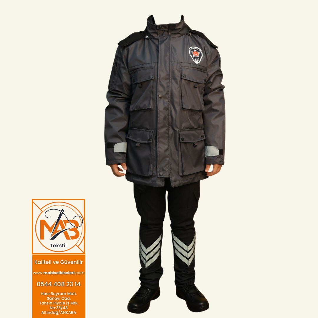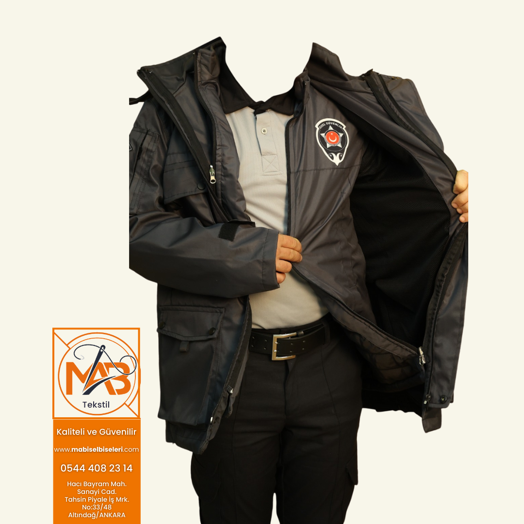 - Görselde bulunan yeni tip yönetmeliğe uygun kamu özel güvenlik (iç montlu) ürünü kaban ve iç mont olarak 1 parçadan oluşmaktadır.
